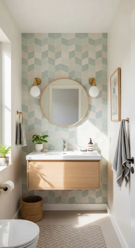 Position statement wallpaper textures strategically on one feature wall behind the vanity or toilet area to create visual interest without overwhelming small spaces. Stick with lighter backgrounds featuring muted pastels or neutral tones that allow natural light to bounce freely throughout the room, maintaining an airy feel while adding personality to your child’s daily routine. For boys’ bathrooms, consider incorporating bold colors alongside these softer elements to create dynamic contrast while maintaining the sophisticated aesthetic.