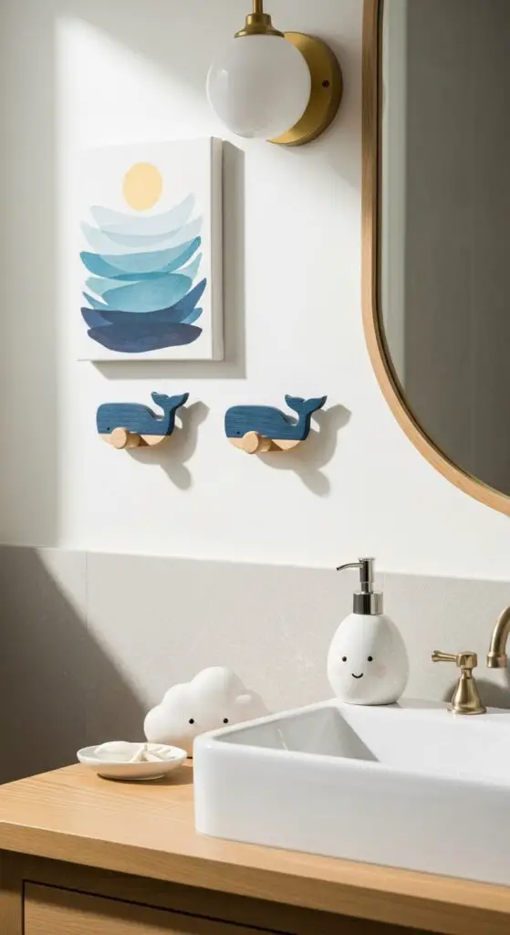 Select sophisticated artwork featuring abstract ocean waves, geometric animals, or constellation maps that spark imagination without screaming “kids’ room.” Incorporate subtle themed elements through quality materials like wooden whale hooks, brass star-shaped mirrors, or ceramic cloud-shaped soap dispensers. These thoughtful touches create personality while preserving the bathroom’s modern aesthetic and ensuring longevity as your child matures.