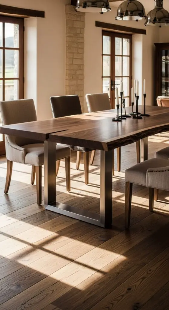 When you’re looking to anchor your modern rustic dining room, live-edge wood tables paired with sleek metal bases create the perfect balance between natural warmth and contemporary sophistication. These statement pieces showcase wood’s organic beauty while maintaining clean, minimalist lines that won’t overwhelm your space.