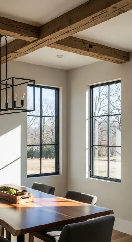 Custom window casings in sleek profiles complement weathered wooden beams overhead, creating intentional contrast. Consider black steel frames against reclaimed oak beams for dramatic effect. Salvaged beam installations positioned parallel to large windows draw natural light deeper into your space while maintaining authentic character. This pairing converts your dining room into an architectural wonder where old meets new seamlessly.