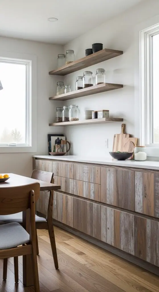 Install distressed wood shelving with clean lines to display your favorite dishes while maintaining organization. Fill textured glass storage jars with pantry staples—they’ll add visual interest while keeping essentials accessible. Consider floating shelves with distressed finishes paired with modern hardware. This combination gives you freedom to showcase personal collections while ensuring everything has its designated place.