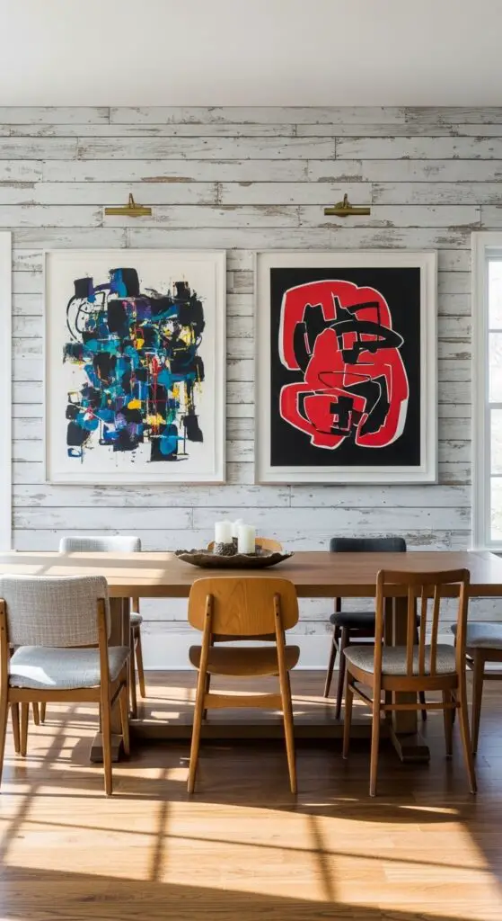 When you pair contemporary artwork with shiplap feature walls, you’re creating a stunning focal point that bridges modern sophistication with rustic charm. Choose bold abstract paintings that contrast beautifully against white or natural distressed wood paneling.