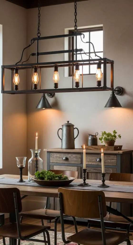 Weathered metal sconces flanking your buffet or mounted on accent walls provide ambient lighting that enhances the room’s cozy atmosphere. Look for pieces with galvanized finishes, rope details, or reclaimed wood accents that complement your rustic aesthetic while maintaining clean, modern lines. For intimate dining areas, consider smaller-scale chandeliers that deliver luxury without dominating the space.