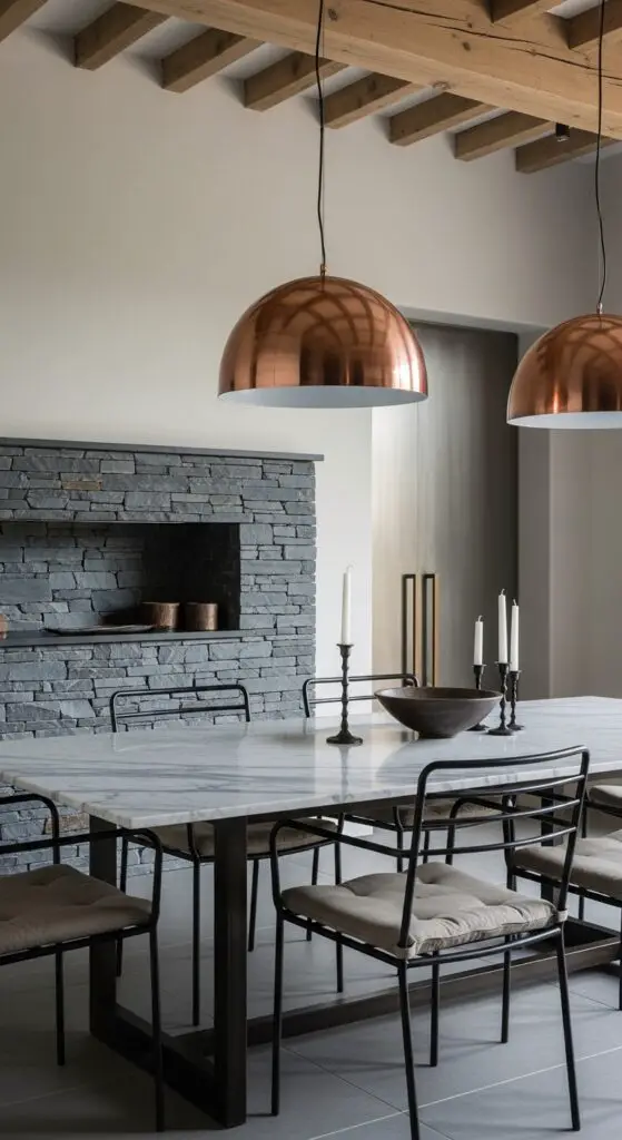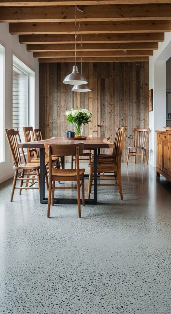 Raw concrete finishes provide the perfect neutral backdrop for showcasing weathered wood’s natural character. Consider adding a live-edge walnut table or distressed oak floating shelves to warm the space. You can soften the industrial edge by incorporating wooden ceiling beams or a rustic wood accent wall behind your dining area.