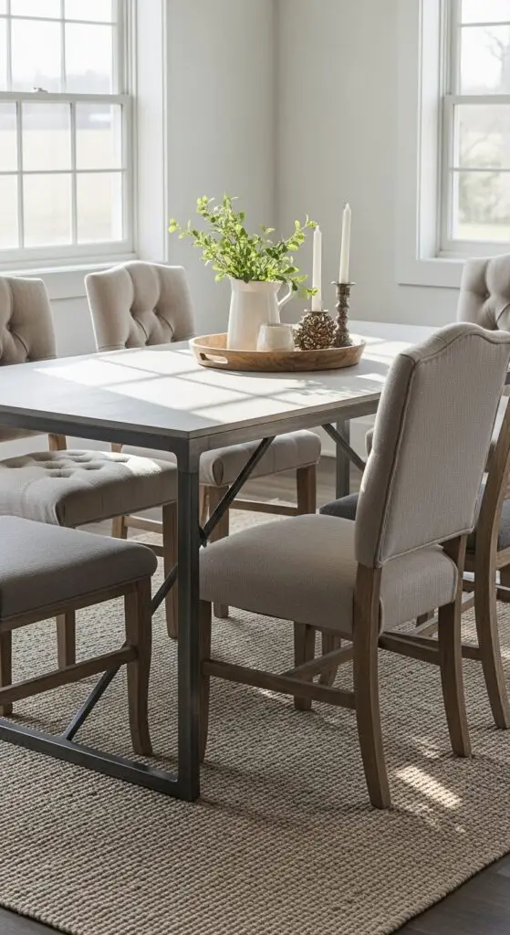 Mix different chair styles around one clean-lined table to create visual interest. This approach lets you express personal style while achieving the perfect modern rustic aesthetic you’re seeking. Look for antique finds at local markets to add authentic character pieces that complement your contemporary table selection.