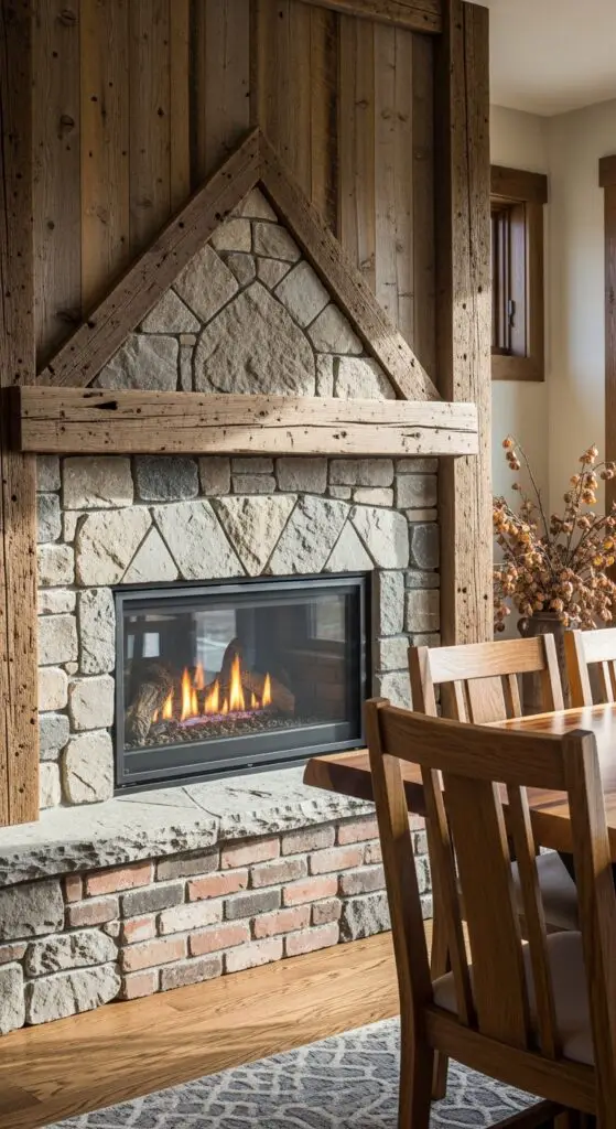 A sleek, linear fireplace paired with natural stone or reclaimed wood creates the perfect focal point for your modern rustic dining room. You’ll want to balance contemporary fireplace technology with authentic materials that tell a story.