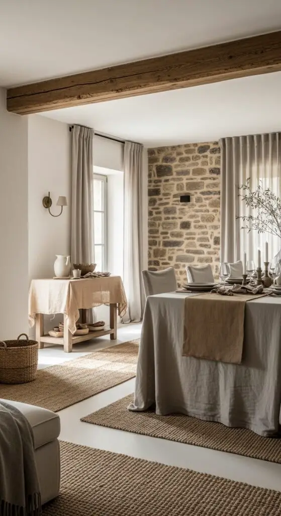 Layer textured neutral accents through linen curtains, burlap table runners, and ceramic pottery to add visual depth without overwhelming your space. Mix smooth surfaces with coarse textures—pair sleek dining chairs with a distressed wooden table, or combine polished concrete floors with chunky knit throws for vibrant contrast.