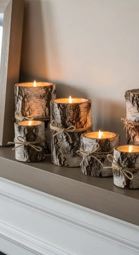 Create birch bark votive holders by wrapping small glass containers, allowing candlelight to filter through the bark’s natural texture. For larger displays, use birch bark candle wraps around pillar candles of varying heights. These organic accents bring forest tranquility indoors while maintaining your decorating freedom. Position these cozy fireplace decor elements on mantels or side tables to welcome spring’s charm throughout your home.