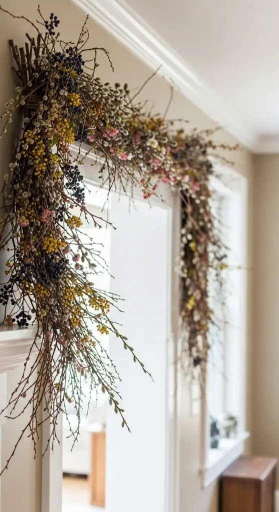 Building on these textural elements, foraged berry and bud garland swags bring authentic seasonal charm that captures spring’s awakening through nature’s own decorative presents. I’ll show you how creating these natural arrangements alters your space with minimal effort and maximum impact.