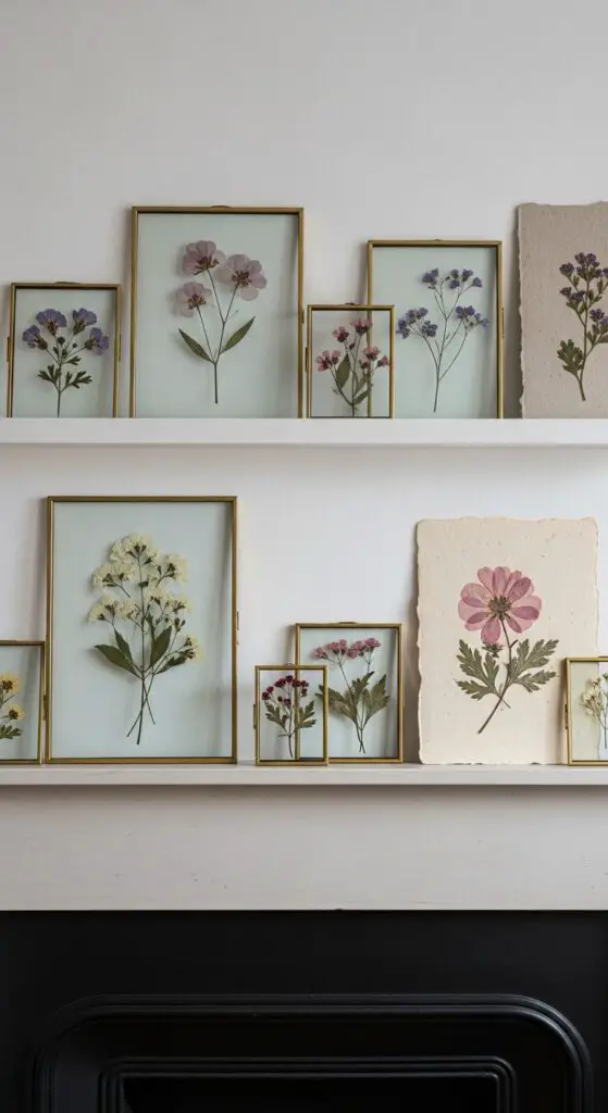 I create dried pressed flower art by placing fresh blooms between parchment paper and heavy books for two weeks. Once dried, I arrange these preserved specimens in glass frames with natural backgrounds like handmade paper or linen fabric.