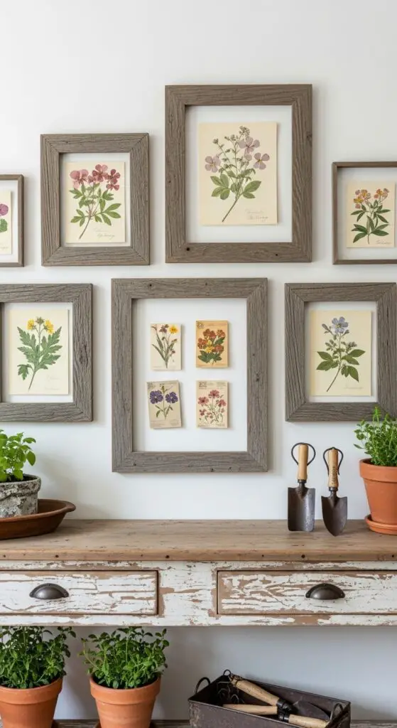 Don’t forget to incorporate distressed wood trays beneath framed pieces for displaying small potted herbs or vintage gardening tools.