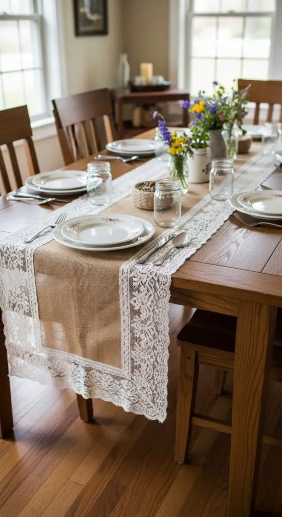 Farmhouse dining rooms gain instant charm through burlap and lace table runners that perfectly balance rustic texture with delicate femininity. I love how these runners create stunning focal points that celebrate spring’s natural beauty while maintaining that coveted country aesthetic.