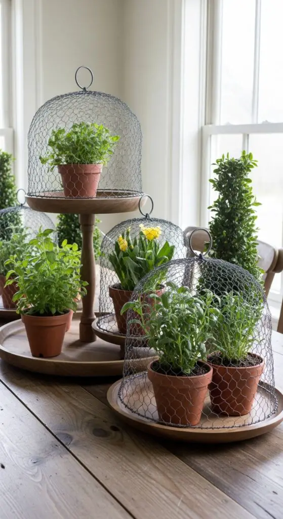Place vintage spring cloches over potted herbs, miniature topiaries, or delicate flower arrangements on rustic tiered platters. The wire mesh adds textural interest while protecting displays from curious pets or drafts. You can craft your own using chicken wire formed over bowls, securing edges with pliers.