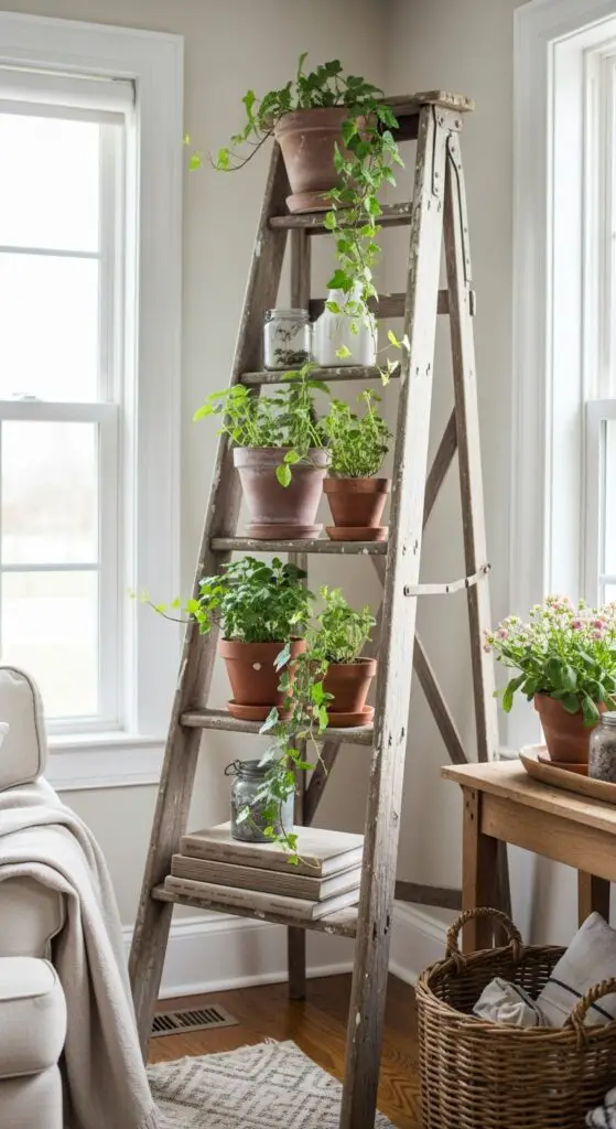 Look for ladders with rough hewn wood planks that add authentic texture to your displays. Position them against walls or use A-frame styles as freestanding units. The natural wear patterns enhance that charming farmhouse style you’re craving.