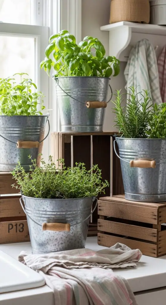 Galvanized bucket planters bring together rustic farmhouse style with the fresh functionality of growing your own herbs right on your dining table or kitchen counter. I love using vintage metal buckets because they add authentic character while providing excellent drainage for herb cultivation.