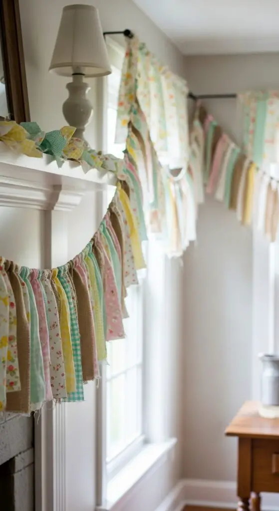 Cut fabric strips in mint green, butter yellow, and blush pink, varying widths from two to four inches. Mix cotton, linen, and burlap for contrasting textures. Thread strips onto twine, alternating colors and materials every six inches.