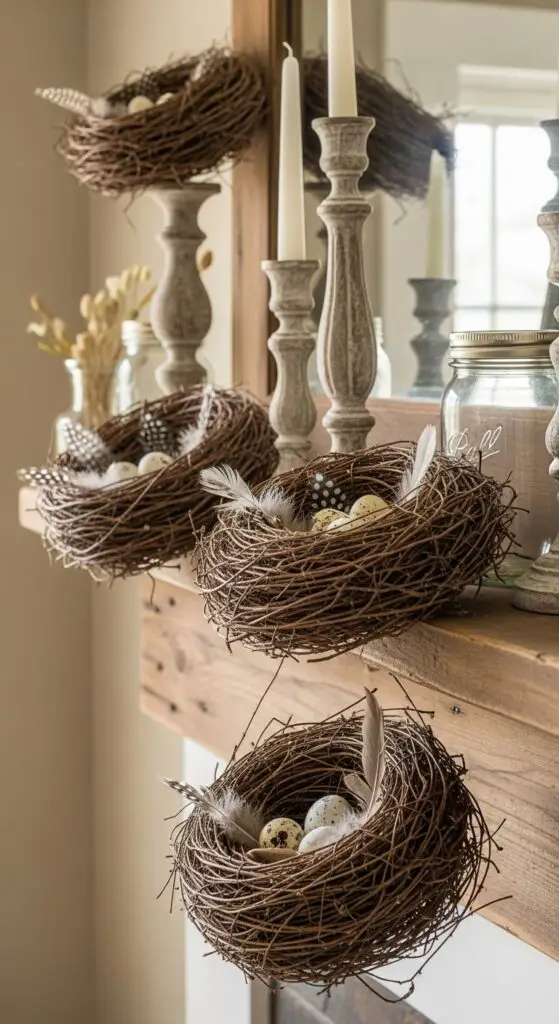 Primitive bird nest decorations convert your rustic mantel into an engaging focal point that commemorates spring’s renewal and natural allure. I recommend positioning hand woven bird nests at varying heights to create visual depth and natural movement across your mantelscape.