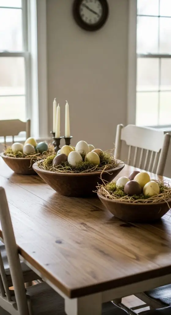Choose weathered bowls in various sizes to create visual interest across your mantel or dining table. Fill them with blown eggs in soft cream, pale yellow, and muted brown shades. You’ll find these natural tones complement rustic wood beautifully while maintaining that coveted primitive aesthetic.