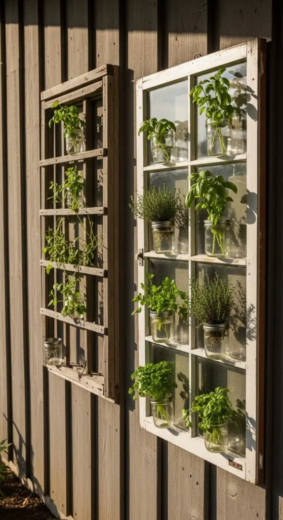 You can attach small planters or mason jars to each window section, creating organized growing spaces for basil, thyme, and parsley. I often add salvaged wood trellises behind the frames to support climbing herbs like oregano.