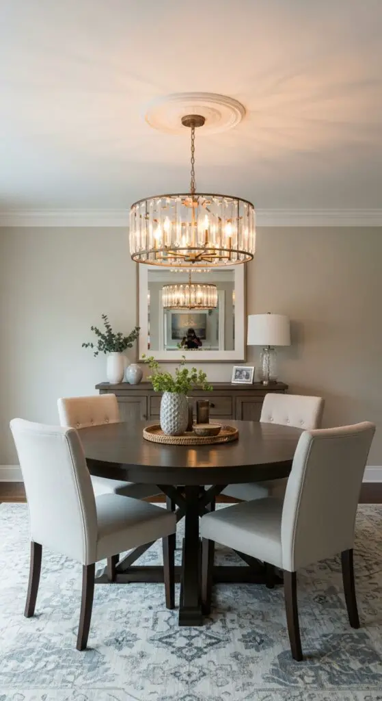 Install ambient pendant lighting above your round table, positioning it 30-36 inches from the surface. Add table lamps on sideboards or floating shelves to create warm pools of light around the room’s perimeter. Consider dimmable options that let you adjust brightness throughout the evening, shifting seamlessly from bright dinner prep to intimate conversation.
