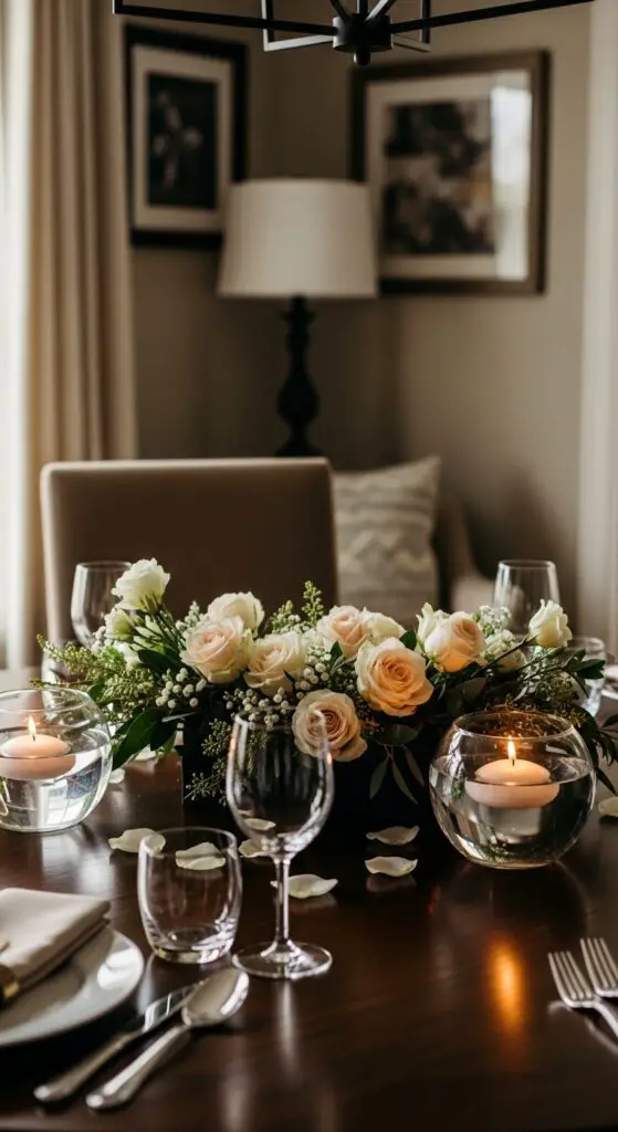 Choose wide, shallow arrangements with roses, peonies, or succulents spread horizontally rather than vertically. Floating candle displays create intimate ambiance without towering over guests. Fill glass bowls with water, add floating candles, and scatter flower petals around the base. These arrangements provide warmth and visual interest while preserving the open, welcoming atmosphere that makes round tables special. Consider adapting your centerpiece ideas to match different seasons throughout the year for fresh, updated looks.
