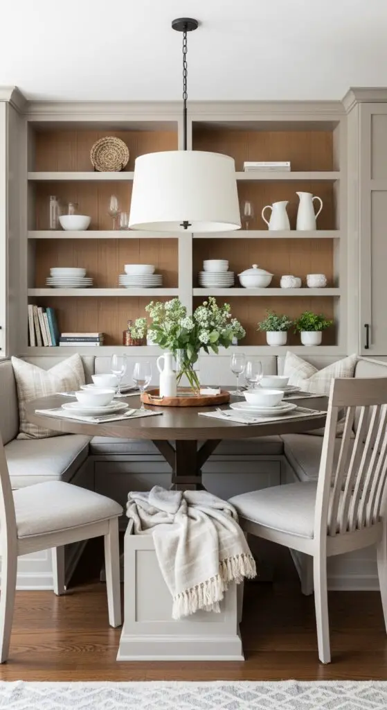 Built-in storage solutions alter the area around your round dining table into a highly functional space that eliminates clutter while maintaining visual appeal. You’ll maximize your room’s potential by installing built in benches with hidden compartments beneath the seating. These clever additions store linens, seasonal dishes, and entertaining essentials while providing extra seating for guests.