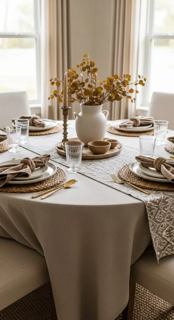 Natural light alters your carefully layered textures into a fluid presentation that changes gracefully throughout the day. Place table near windows to maximize this variable illumination that modifies your dining experience from morning coffee to evening gatherings.