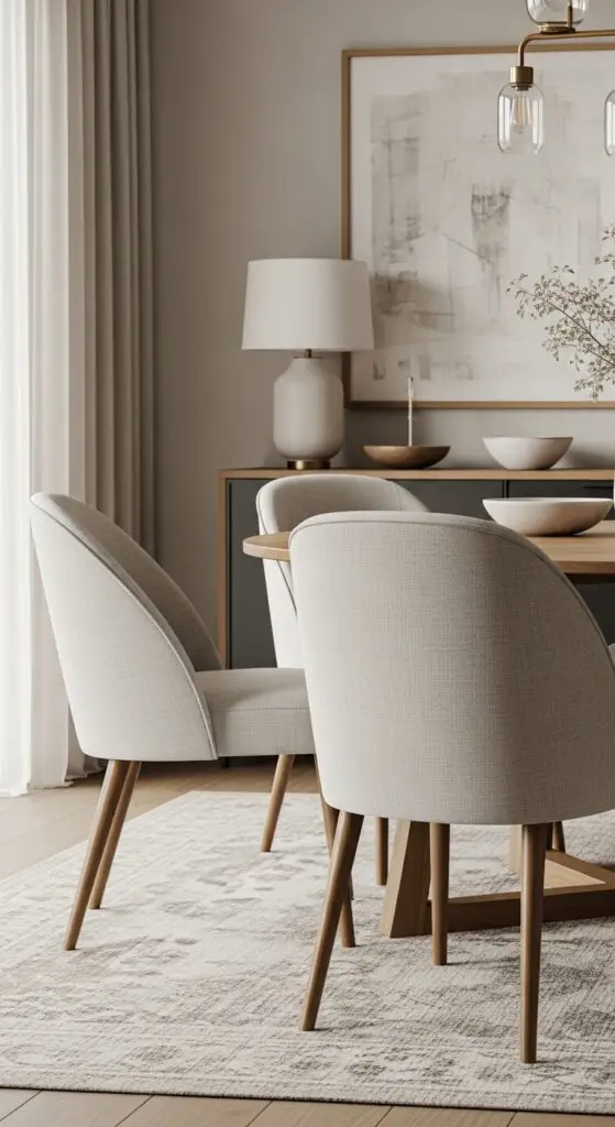 Curved chair backs complement round tables perfectly by repeating the circular theme throughout your room. Look for chairs with subtle back curves or rounded edges that reinforce your table’s soft, flowing aesthetic while providing comfortable support.