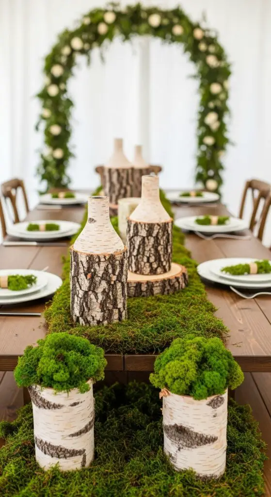 Create stunning moss accents by covering table runners or ceremony arch bases with preserved moss. You’ll achieve organic beauty that requires minimal maintenance. Combine both elements on wooden signs or card display areas. These affordable materials alter any venue into a forest-inspired celebration space.