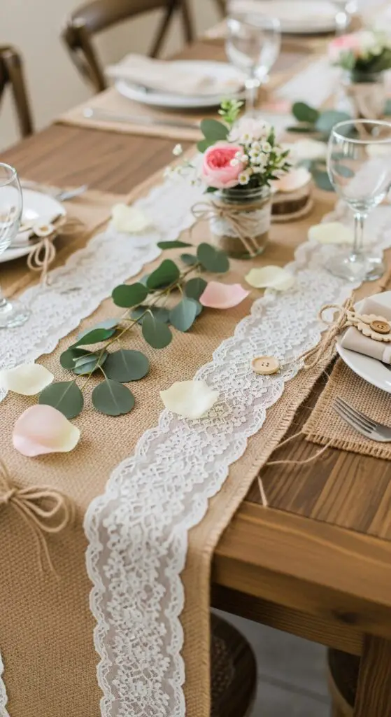 You’ll create stunning visual depth by incorporating burlap runner embellishments like wooden buttons, twine bows, or small mason jars filled with wildflowers. Consider adding personalized embroidered napkins in soft pastels to complement the earthy base. These farmhouse-inspired elements bring authentic rustic appeal to your celebration while maintaining the sophisticated atmosphere you’re seeking.