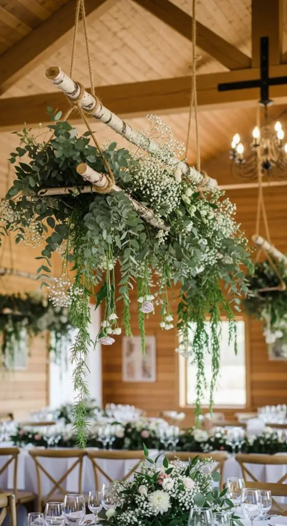 Suspended foliage arrangements work beautifully at varying heights, adding dimensional interest to any venue. Mix eucalyptus, baby’s breath, and seasonal flowers for texture. Secure installations properly with heavy-duty fishing line or decorative rope that complements your rustic aesthetic perfectly. These overhead displays transition seamlessly from ceremony to reception, bringing the same natural beauty that makes outdoor spring décor so captivating to your indoor celebration.