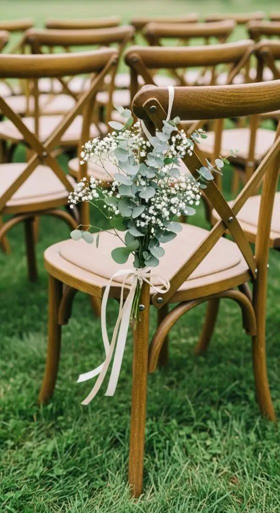 Minimal floral accents work beautifully here—think single stems of eucalyptus, baby’s breath, or seasonal wildflowers. You’ll create stunning focal points by alternating decorated chairs with plain ones throughout your ceremony rows. This approach maintains visual balance while keeping costs manageable for your celebration.