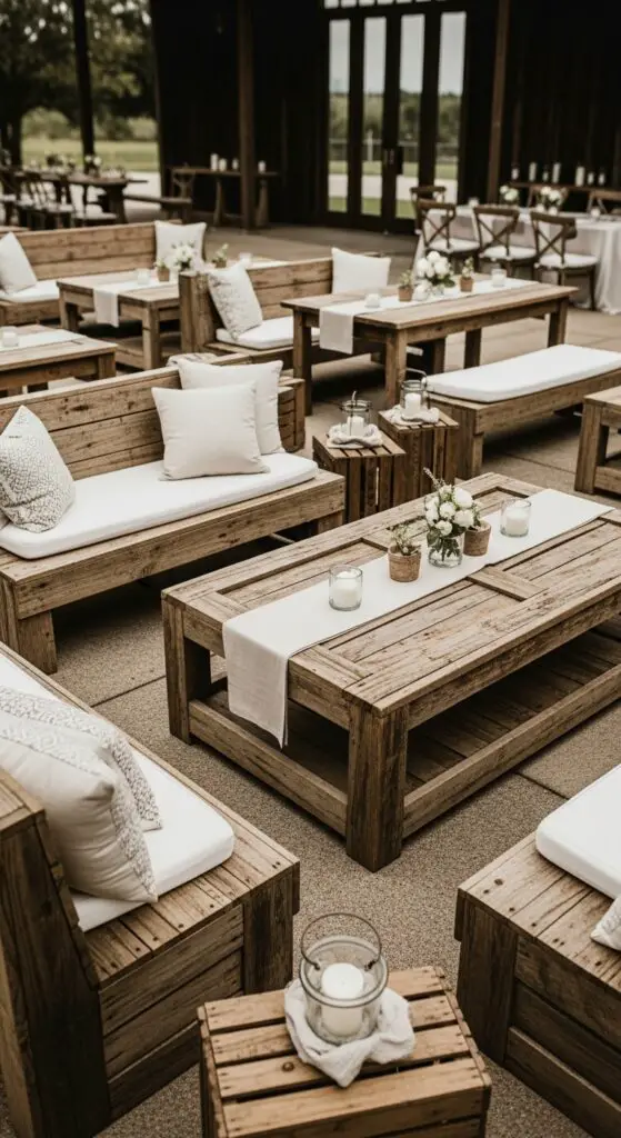 Building on these natural textures, reclaimed wood furniture modifies outdoor wedding spaces into inviting lounges that perfectly complement your rustic spring celebration. I recommend positioning weathered wooden benches and vintage farm tables throughout your ceremony and reception areas to create intimate gathering spots.