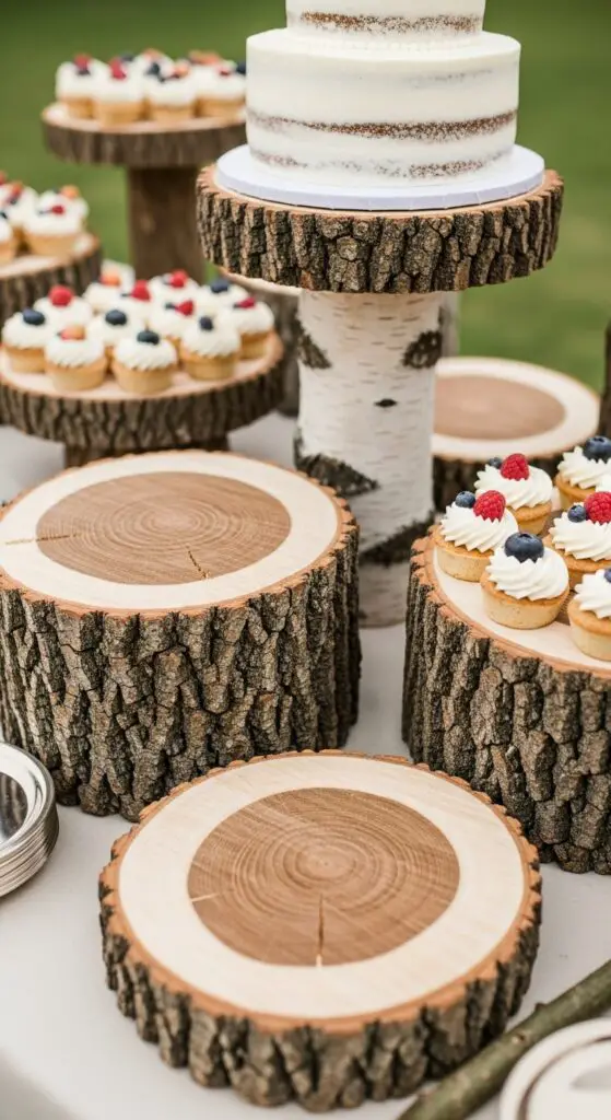 You can sand the surfaces smooth and apply food-safe sealant for direct contact with cakes and pastries. Log pedestals work wonderfully as raised bases for your main wedding cake, adding natural height and visual interest.