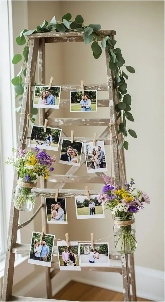 These rustic ladder displays work perfectly when positioned at ceremony entrances or reception corners, creating intimate photo galleries that tell your love story. Drape eucalyptus garlands between rungs and clip framed photos with miniature clothespins for added vintage appeal.