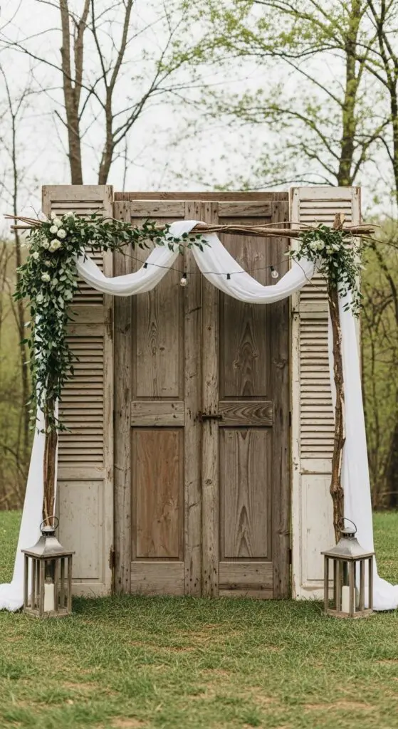 Consider building rustic branch arches using locally sourced materials for an organic, unstructured look. You can enhance these backdrops with trailing greenery, soft fabric draping, or string lights for evening ceremonies. Mix different wood tones and textures to create visual depth that photographs beautifully against spring’s emerging scenery. Complete your rustic spring setup with vintage touches like antique lanterns or weathered mason jars filled with wildflowers.