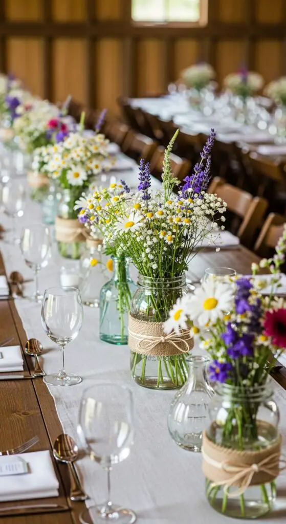 Gather seasonal blooms like daisies, lavender, and baby’s breath from local fields or farmers’ markets. Mix different jar sizes and vintage vessels for visual interest across your tables. Wrap twine around mason jars or add burlap ribbons to enhance that countryside charm you’re seeking.