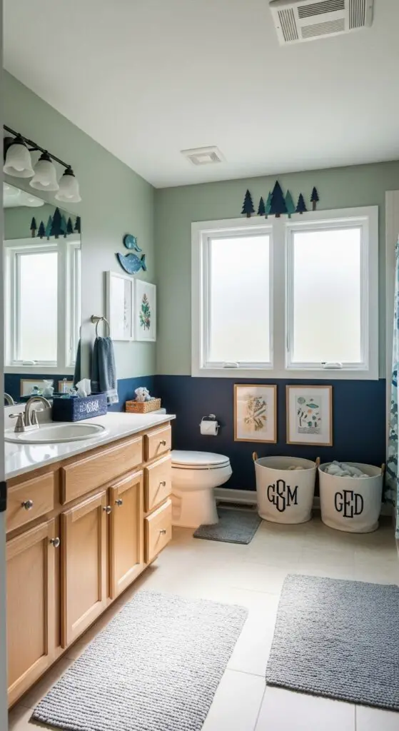Gender-neutral themes create harmony in shared spaces while ensuring both siblings feel comfortable and represented in their bathroom environment. You’ll find success with nature-inspired motifs like ocean waves, forest animals, or celestial designs that transcend traditional gender boundaries.