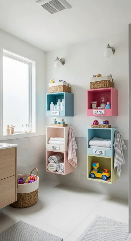 Dedicated storage cubbies work exceptionally well for towels, toiletries, and personal items. Mount these at appropriate heights so kids can independently access their belongings. You can also designate separate drawers or baskets for each sibling. This system teaches responsibility while reducing conflicts over shared items and missing belongings. Additionally, implement smart toy organization solutions to keep bath toys contained and prevent them from cluttering the shared space.