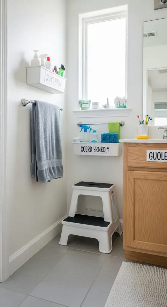 Lower compartments should house daily essentials like toothbrushes and washcloths for easy access. Space saving cabinetry with pull-out drawers maximizes vertical storage while keeping items within reach. Place frequently used items at child-friendly heights, then reserve upper shelves for adult supervision items.
