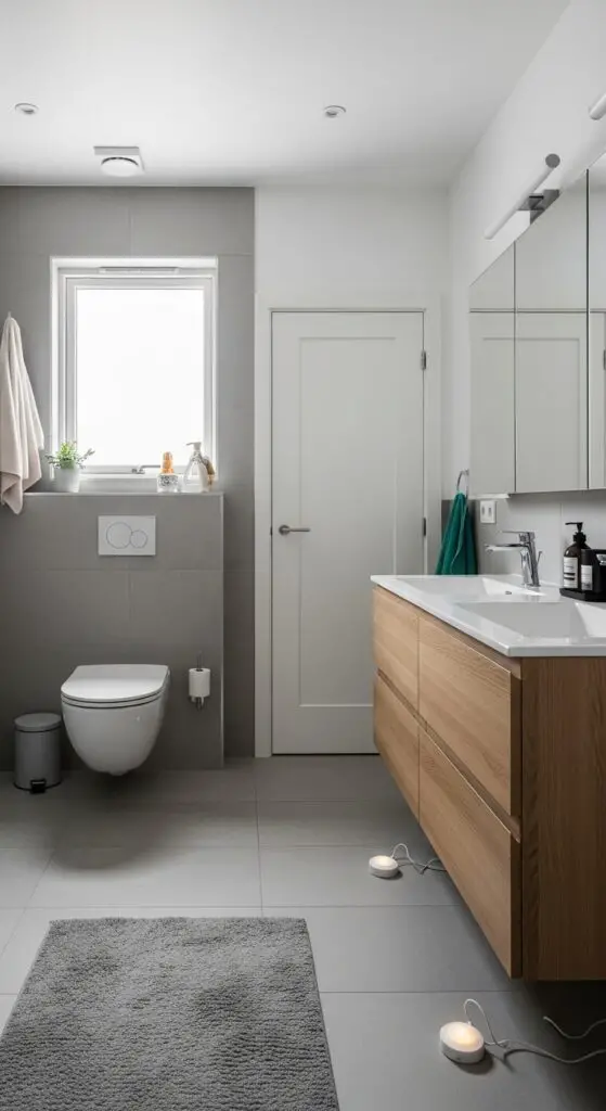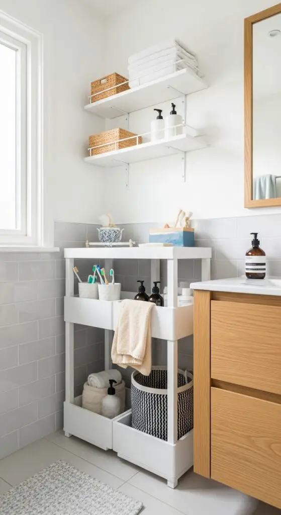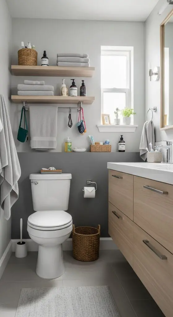 Wall mounted shelves above the toilet hold towels, toiletries, and personal items without cluttering countertops. Install floating vanity cabinets that create the illusion of more space while providing essential storage underneath.