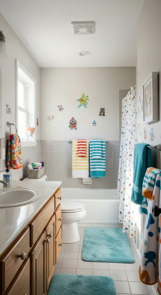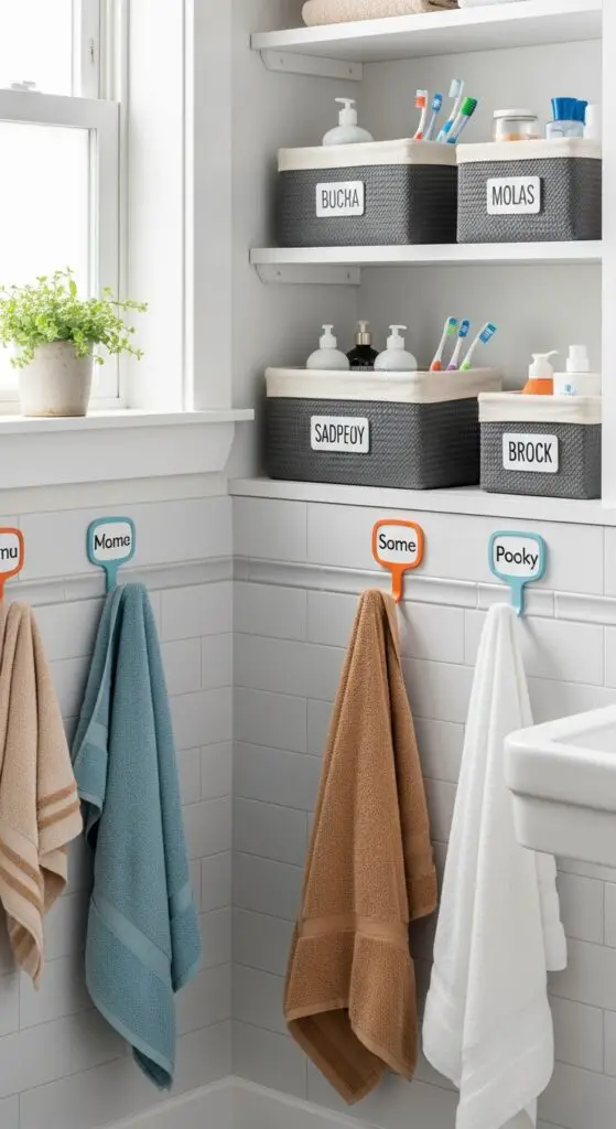 Assigning each child their own towel hooks and personal accessories creates clear boundaries while reducing bathroom conflicts between siblings. Install personalized towel racks at appropriate heights for each child’s reach, using colored hooks or name labels for easy identification.