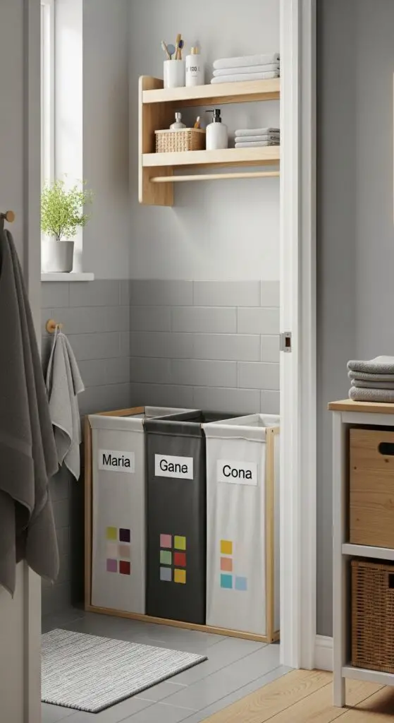 Individual laundry baskets work perfectly when labeled with each sibling’s name or color-coded system. Position these storage solutions near the bathroom entrance for easy access during daily routines. This setup eliminates arguments over mixed clothing while teaching responsibility.