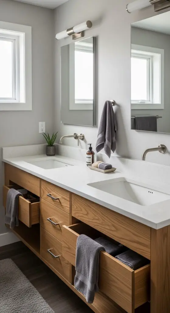 Install stackable shelving units near the vanity to maximize vertical space while keeping everything accessible. Choose clear containers so kids can quickly identify their belongings without digging through others’ items. Color-coded labels work especially well for younger children who can’t read yet.