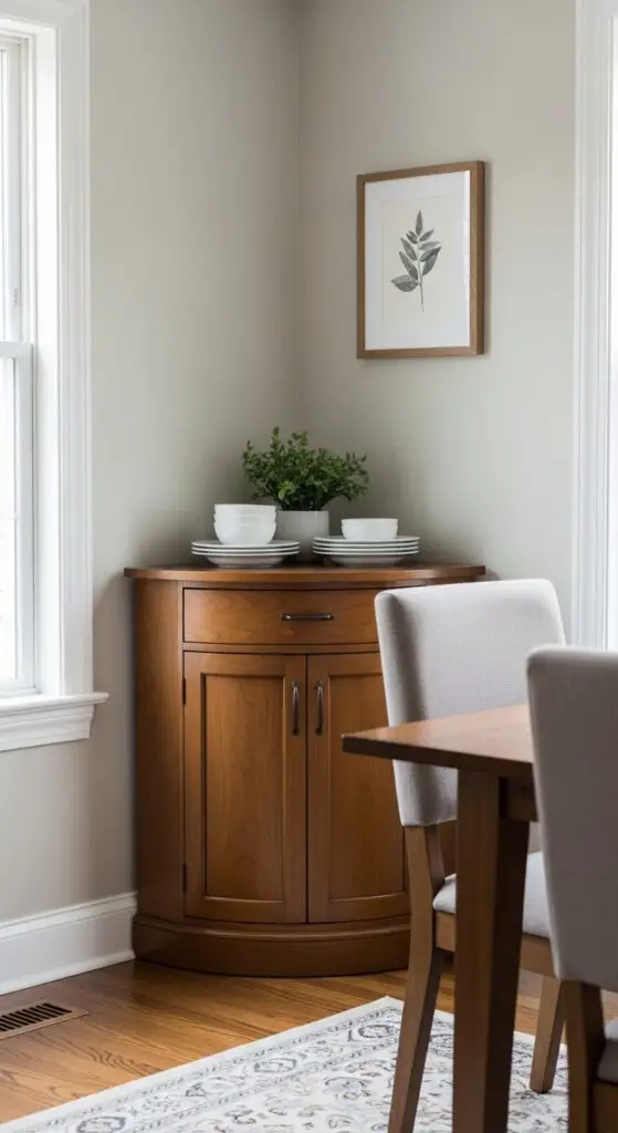 Corner buffets convert overlooked angles in your dining room into powerful storage solutions that work twice as hard as traditional straight-line furniture. You’ll maximize every square inch while creating functional beauty that doesn’t compromise your room’s flow.
