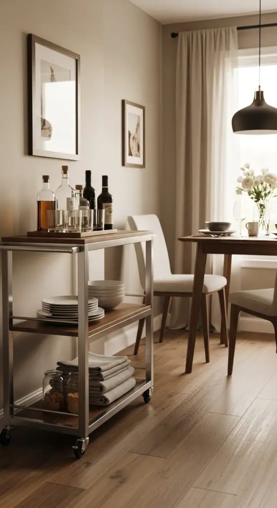 Mobility alters your dining room storage strategy when you choose bar cart buffets that roll wherever you need extra serving space or tuck away completely during large gatherings. Rolling bar carts adapt to your hosting needs, converting from everyday storage into party-ready serving stations.