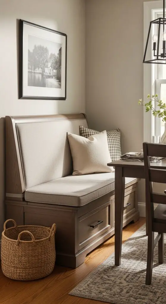Choose modular bench seating that allows you to reconfigure your layout based on your current needs. Look for pieces with lift-up tops or built-in drawers to store linens, serving pieces, and seasonal décor. You’ll maximize every inch while creating an inviting space that adapts to any occasion.