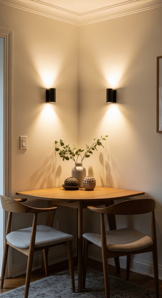Proper lighting alters any dining space from merely functional to genuinely appealing, and corner sconces offer a graceful resolution that doesn’t require floor or table space.