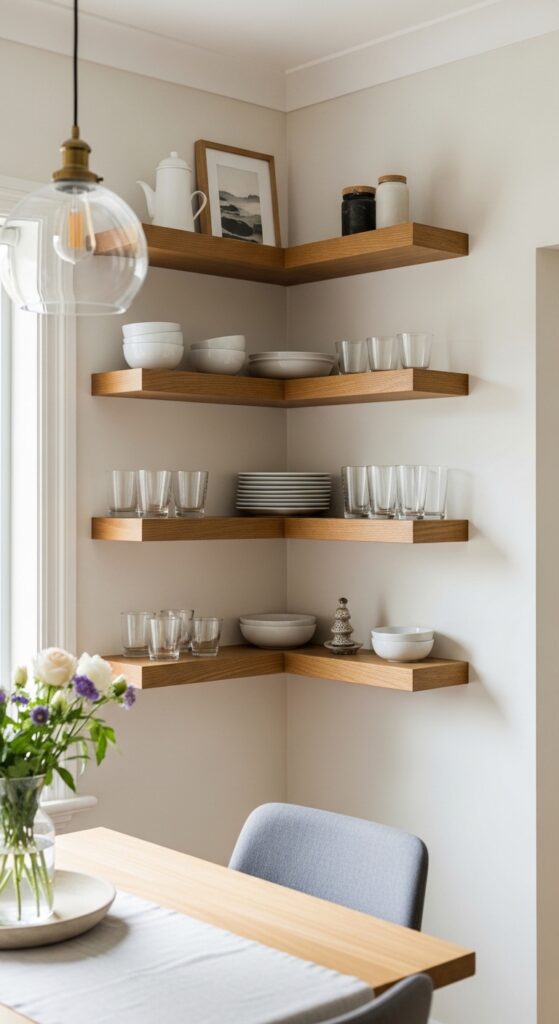 Choose floating corner shelves in materials that complement your dining room’s aesthetic—sleek metal for modern spaces or warm wood for traditional styles. Position them at varying heights to create visual interest while storing everyday essentials within easy reach. Smart storage solutions like these floating shelves help maintain an organized and clutter-free dining environment. This solution converts dead corners into functional storage without sacrificing floor space.