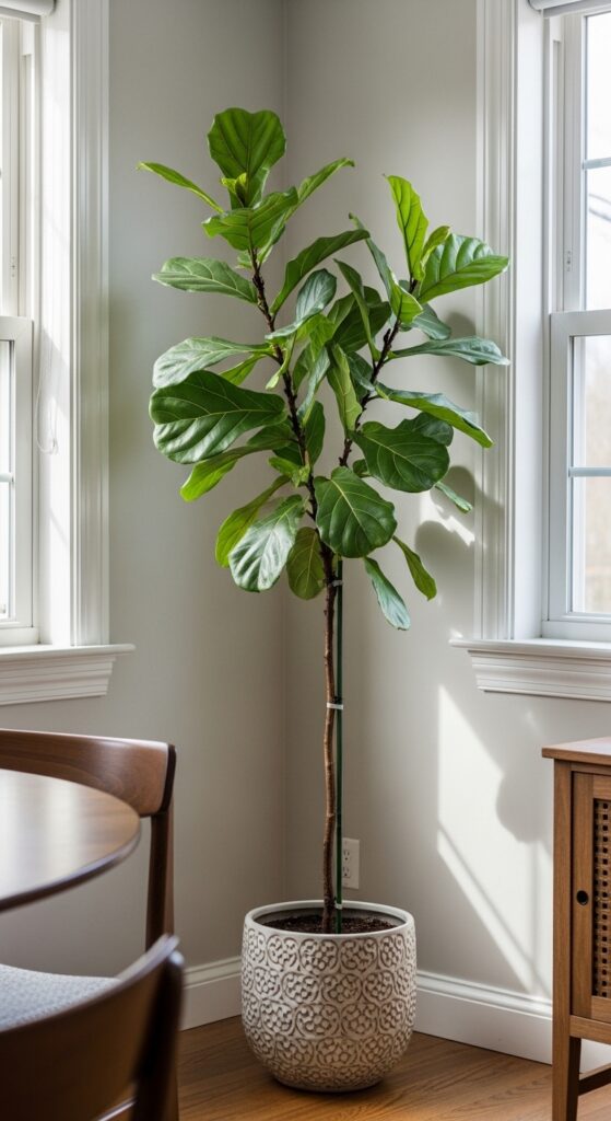 Tall corner plants convert empty dining room corners into striking vertical focal points that draw the eye upward and create an illusion of greater height. You’ll maximize your space’s potential through strategic plant selection that complements your dining room’s scale and lighting conditions.